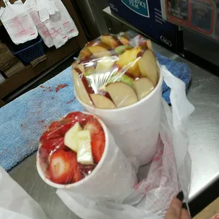 The fruit cups are so good very fresh fruit very nice small place where you can go and sit down and eat as well have lunch specials I ordered a cheeseburger that was very good highly recommend stopping here for fruit cup
