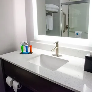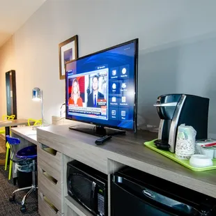 Each guestroom feature a 43" flat screen TV, Keurig coffee maker, Microwave, and mini-fridge