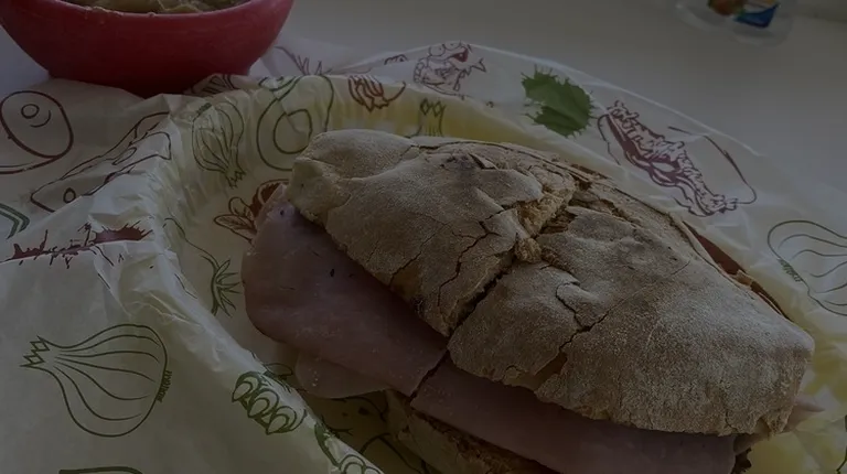 Mayonessa (mayonnaise), jamon (ham), queso amarillo (yellow cheese), lechuga (lettuce), tomate (tomato), cebolla (onion), aguacate (avocado) en pan telera, incluye papas fritas (includes french fries).
