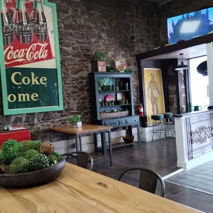 Very nice place. Posters, plaques, signs hanging on the walls. The first time inside was yesterday Friday 03/ 01/2024.Old cartoons on one screen and 80s wrestling on the other. Nice setup with the front main entrance, the eating area classic old wood top and thick metal frames that won't bend . Hotdogs were great as was the cupcakes and cheese bars. Mrs Cox, one x, is a charming lady. I could have talked to Mrs. Cox for hours. Great place.
