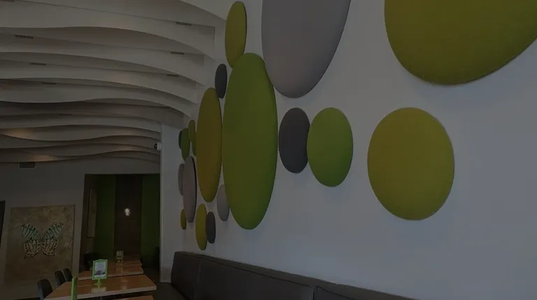 a modern dining room with green accents