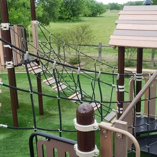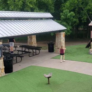 I only gave 4 stars because of the spiderwebs. There's a beautiful wooded area on the lot and that brings the spiders. No big deal, but it's good to know so you can check out the spaces before the kids.The 360 sight-lines are excellent at this park. The pavilion is a nice 4 picnic table area with around rock wall along the back side - chair height, so PLENTY of seating. The pavilion is partially uncovered (2 tables are covered and 2 are not). But it's INSIDE the playground, which is awesome. I've visited a few parks lately in hopes of a pavilion inside the park (not on the outskirts). The bathrooms are also extremely convenient. I didn't visit them, so I can't attest to their cleanliness. There's structures for smaller kids and larger kids. Structures that are more challenging (like a rockwall, ladder stairs, or rope climb) and structures with steps. There is a music area too. And there are 2 small play houses - locked, but they are good for pretend play (on the porch). A ton of parking. And at least 2 drinking fountains (however, the one next to the pavilion wasn't operating when we tried it).There are only 2 infant swings (no standard swings). I think there are 5 slides of varying heights/styles.