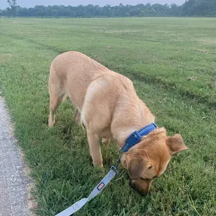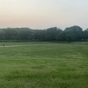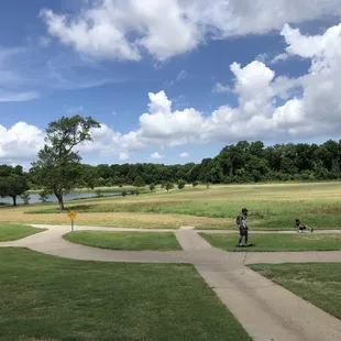 This review is for the dog park.Out of the three dog parks in Plano (Windhaven, Carter, Woodruff), we like the layout of this dog park the least, but it is still spacious and our dogs have fun. The areas are divided into multiple areas (large dog, small dogs, etc) and the areas are pretty much huge grass areas. Unfortunately there are no walkways to go further down the grass area, so while dogs go down, humans tend to stay close to the front where there are a few benches available. With that, humans naturally don't go to that area and don't pick up their dog poop!Other than that picky thing, my dogs have fun. They meet other cool dogs and they get to play, run and catch balls. That's the most important thing amirite