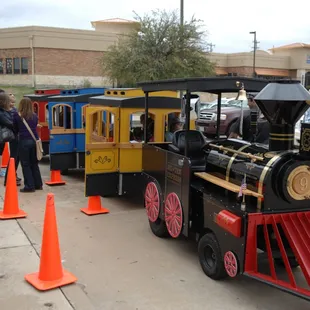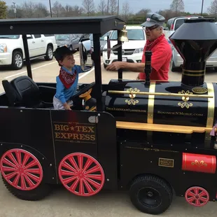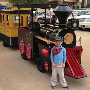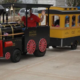 I was having a 5th birthday party for my son in February, and looked everywhere for the right train to really give the party the elegance I was shooting for. It was easy to book the train online, and they emailed me my invoice. Unfortunately, two days before the party there were ice storms and we elected to postpone the party for March. I alerted all my guests and we booked another day. There was a slight confusion about the train, and when it was determined I couldn't get Big Tex (which I had my heart set on) the owner did everything she could to ensure I had it, knowing it meant so much. The day of the party, the engineer Steve called me to let me know he was setting up in the back to maintain the surprise. Therefore, when he arrived at 3:45, he drove past the window and the entire room erupted in cheers. The children (and all the adults) ran out the door and started jumping on the train. Big Tex was spotlessly clean, and incredibly beautiful. Engineer Steve wore an engineers hat and red bandana around his neck just like the birthday boy. He was enthusiastic and completely charmed the children. The train made multiple runs and each time he played music (mostly from The Polar Express). It was absolutely magestic. Engineer Steve even encouraged the parents to participate, and got my mother to ride it. She loved it. As per the recommendation of Bounce 'N' More, I hired the train for one hour which was perfect. That way there was time to play other games and do the cake without distraction. After he was done with his rounds, he allowed my son to sit in the engine and ring the bell for photographs. It was the best day of my son's life. There is a destination charge of $50 on top of the cost of the train which is absolutely worth it for such a beautiful piece of equipment. It was clean, and the colors were bright and gorgeous. I would absolutely hire this train again.I hired a venue for the party, and the train had full use of the parking lot. If hiring the train for an event where it will need to use public roads (like at a home), make sure you check with your city before booking it. Carrollton gave me a hard time when I wanted to do the party at home, but it was perfect where I ultimately had it.