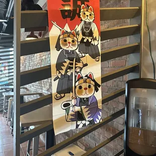 a restaurant counter with pictures on the wall