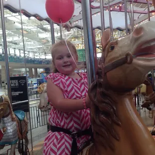We can't go to the mall and not ride the carousel. My kid loves it. It's a little pricey, but worth it. For a $5 bill you get 3 tokens, and for a $10 you get 5. So we always use two $5 so we can get that extra token :)Always fun.