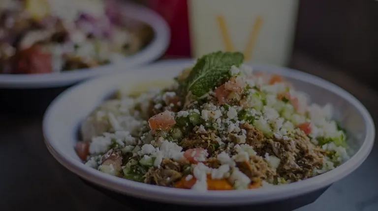 Interesting parody of Mediterranean food, concieved by some MBA from Iowa, possibly septic after a meal at Chipotle.Falafel reimagined as deep fried bean burrito, on pita as pupusa.Imaginative and novel use of the bowl concept avoids the gummy flatbreads,which, according to the posters, are plant based.