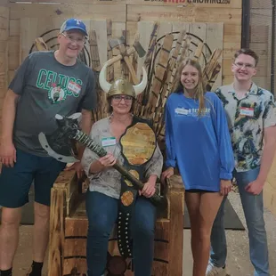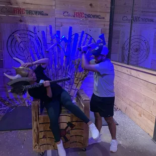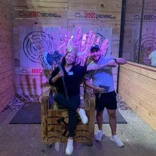Tremendously fun experience here. Came with some friends for my birthday and had an absolute blast. This was my first time axe throwing, and our "trainer" Noah did a great job of showing us the hows, whys, and whats to get us up to speed on some wood-splitting entertainment. They have lots of different games to play so that you don't lose interest (if, that is, you're one of those people bored by hurling sharp objects into wood at deadly velocities) and advice for how to improve as you go. It's BYOB and they have bottle openers at all the tables. I highly recommend this place. Really great time for time with friends, coworkers, or family. There's even a wooden throne and some props for photo-ops. Dead fun. Noah really kicked ass. Not only was he spectacularly good at axe throwing, he was a patient, good-natured dude who kept us smiling and unafraid to try some bizarre trickshots. He even played the damn piano. Give that man a raise.