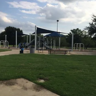 This is a nice park. There are two playgrounds; one for older kids..the other for smaller children. Benches and tables are around the perimeter of the playground for those parents that like to sit; you can always keep a good eye on your kid. Swings for big kids are high so you don't bump your feet to much on the ground. Just enough for a toe kick to get air! Lots of mature trees to provide shade. There is also a well kept basketball court and tennis courts. As well as a good walking or bike trail.Great park!Has 3 entrances.