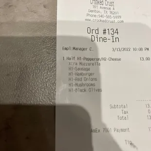 We were in the area and this place popped up and was open. Looking at the reviews the pizza looked delicious. And it was good!Here's where it gets interesting...We inquired about the size. 12 and 16 inch. The "mgr" at the counter indicated we could split the pizza as there were Two of us and we liked different toppings so we ordered a 16 inch. My half consisted of pep, sausage, ground beef, onions, mushrooms, black olives and extra cheese. My sister just wanted cheese on her half.We get our drinks and wait for my name to be called. My sister goes up when it's ready and then she calls for me.They literally made half a pizza. Like never ever, ever, ever have I seen something so funny but stupid at the same time. We were informed we would have to replace the order as we weren't charged correctly, Instead of making it Right. We kept the 4 slices...yup 4 slices. Pizza was good. Service not so good. See pics.