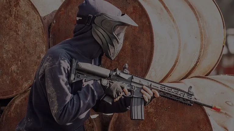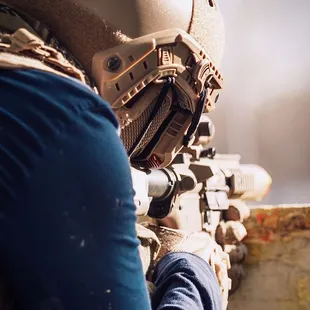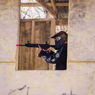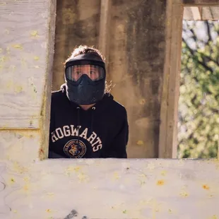 Helmet and paintball gun that they provide! Also parking lot behind and the entrance building