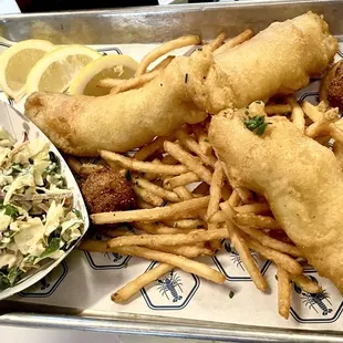 Located right inside the legacy food fall, this fun little spot has lots of seafood options, fast efficient service, and a friendly staff. Loved the fish and chips that came with shoestring fries. It came with 3 large thickly battered fish which was crispy and flavorful. Coleslaw was just meh. Also came with hush puppies and shoestring fries. Overall a good experience.