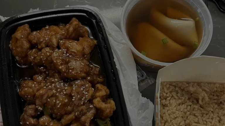 Wanton soup, rice, Sesame Chicken