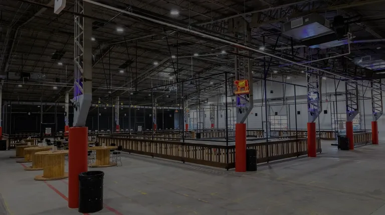 tables and chairs in a large warehouse