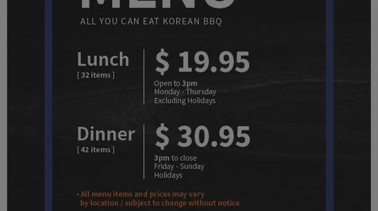 We went here on a Sunday at around 11:30am. There was only one party in there, but as the day went on at 1:00pm the place was half full.Here are some warnings, just be careful where you walk as in most korean BBQ places the floor gets slippery with all of the grease involved. They have three types of menus to eat1. Lunch menu from Monday to Thursday, rest dinner prices2. Dinner menu Friday, Saturday, Sunday3. $20 dollars for premium meatWe ended up getting #3 which ended up costing us $51 dollars a person as we had the gift certificates that we got from Costco. They sold these at the Grand Prairie location if you want to know.We ordered mainly from the premium beef. I enjoyed the short rib on the big bone the most as we ended up getting two. I tried the ribeye steak and I enjoyed it, but my wife thought it was tough. We tried the wagyu beef, but it tasted like pork belly. We tried the sliced thin beef too and that was good as well. We got the lettuce salad which I substituted for the rice.Service was pretty good they were nice and were prompt. The manager even got involved serving the food. It will get slower as it gets busy, but it is okay. We did not enjoy the appetizers too much as I thought the Korean Fried Chicken was dried and it came with chicken breast. The noodles was alright. I did enjoy the dessert though the fried donut with filling, but I wish they did have ice cream as there is a lot of grease.Overall, I enjoyed the food, but it is something I could not do every week, but good once in awhile.