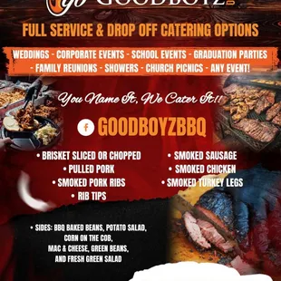 I had Good Boyz BBQ cater our family Christmas dinner. The food (meats and several sides) was all terrific! "T" even threw in some burgers and hotdogs for the children (twice as much as he contracted for). "T" is very friendly and is also business competent. He sent a contract on what we agreed to and had me review and approve it. All I had to do is pay a $100.00 deposit and the rest in cash on delivery. I had surveyed several other BBQ places and none of them could compete with Good Boyz BBQ in price or service. I highly recommend you select them for your next party or event.