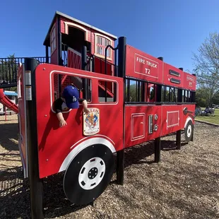 Green Park -- the larger of the playground structures (fire truck theme)/ integrated picnic table and climbing option