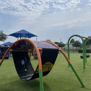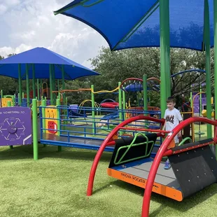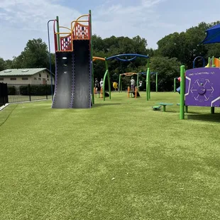My son and I LOVE this park! We travel the 40 minute drive from Terrell at least twice a week to get my little man's energy out. The best part about this park is that it's completely artificial turf, so virtually NO bugs or wood chips, as well as PLENTY of things for the extra little ones to spin, flip, twist, and turn throughout the park that are their height. So not only a park for the big kids, but a super engaging park for the little ones.