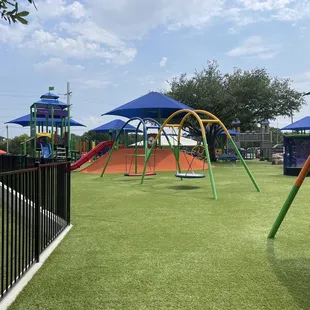 What a gem of a park! A trifecta of fun for everyone! You, the kids and the dog! An active dads dream park as you can get your workout in while the kids play!The Good: This park is sooooo awesome!!! Kids playing area, stacked with every "jungle gym" you can imagine! Traditional Swings, like 7 different types! Merry go round! They banned those in California years ago! This park got TWO!! And a dog park right next to it! Cmon! Plus the pool to cool off in after you get your play on! This park is it!!!The Bad: the metal, it gets HOT! The plastic grass, it also get HOT! The Ugly: it has a low Red Imported Fire Ant (solenopsis invicta )infestation, but it's on a well hidden area that kids will definitely get stung by. Not sure who to contact, maybe park facility maintenance or a pest control operator, I am one but in the state of California so I couldn't make a service request. Overall this park is amazing, and I'm going to be taking the kids more often every time we visit the great state of Texas!!!
