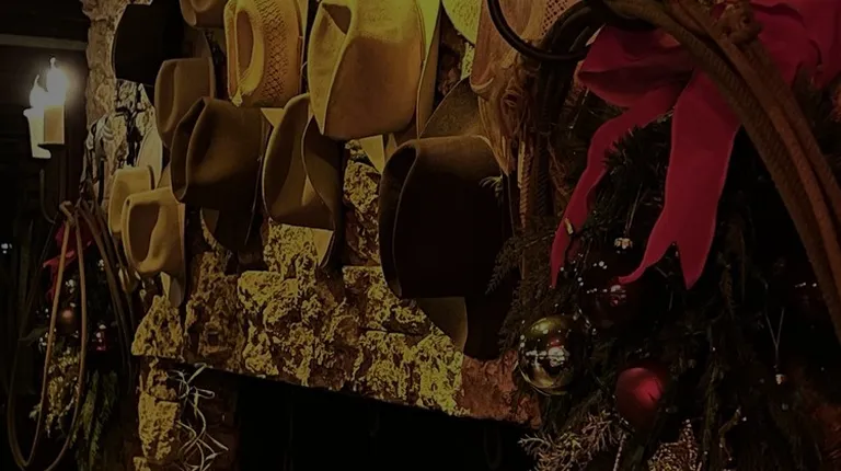 Rock fireplace with cowboy hats in the bar.