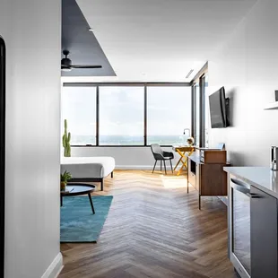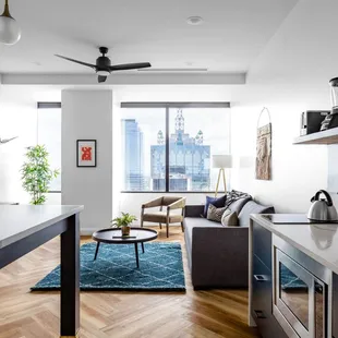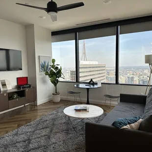 This is NOT a hotel, which wasn't completely clear when I booked on Hotels.com. Overall it was a pleasant experience thoughI got an email the morning that we had booked to stay that I needed to complete virtual check in before they would send me the information on how to access the apartment. This involved submitting a photo, front and back, of my drivers license - odd but okay. Next I was prompted to consent to a BACKGROUND CHECK. No other details on what this meant or encompassed at all. I only booked the room for one night so I felt that this was pretty intrusive and I wasn't fully comfortable in consenting to give this company blanket access to pretty much any and all information about me but the room was booked, paid for and we were already on the way there so I did it. Check in was 3 and by 4 I still hadn't received the email so I installed the Mint House app and used the concierge chat to speak with a rep. He was able to find my reservation and send the email within a few minutes. We arrived around 6pm ( after a 5 hr drive) and the front desk gave us our room keys and had us on our way in 2 minutes. ( The online check in turned out to be great in expediting everything at arrival - still feel weird about the background check thing though) I booked a corner studio suite for the great view and the view was amazing. The room was very clean and the bed was very comfy, great pillows and bedding.The room was very well furnished and the mini kitchen appliances were high end and very nice. The unit that we had was very small and not furnished like the photos online though. There was no sofa or living area in room 4903. There were a couple of chairs that were crammed into a corner because the space was so small. The kitchenette area was very nice. A few glasses were provided as well as some silverware but the area was awkwardly positioned around the corner ( not open concept like the stock photos) and didn't have a sink- which made it a bit awkward if you did want to prepare any food or wash any of the provided dishes after use. Overall for one night the room was perfectly adequate and very comfortable. If staying longer or plan to prepare any food rather than eating out, , upgrading to a one bedroom unit ( which has a full kitchen) would be well worth the extra few bucks. Overall, I would book again - and why not, they already know everything about me after the background check.