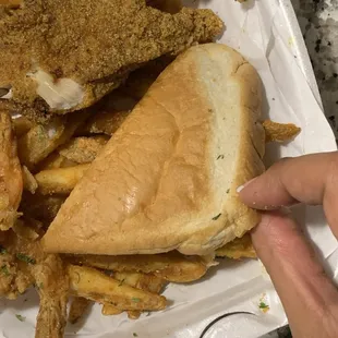 Top: Fried Catfish Filet(2) with fries and Butter Bread Bottom: 1 LB Cajun Shrimp Boil with potatoes, corn and sausage
