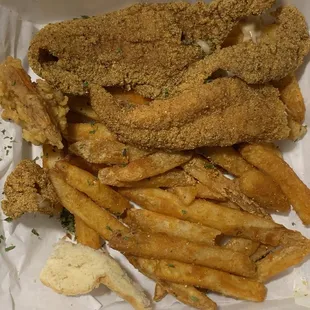 Fried catfish with crispy fries.