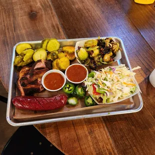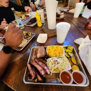 Brisket, pork ribs, mac and cheese, and cole slaw.