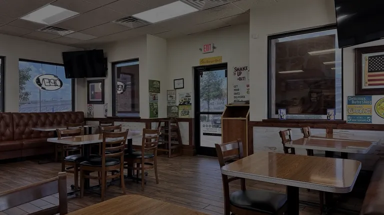 Olive Burger with drivethru lane, along eastbound frontage road of 121 Sam Rayburn Frwy, west of Parkwood Blvd.
