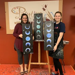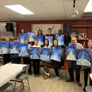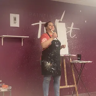 I have a confession to make: I don't have an artistic bone in my body. The good news is you don't have to be artistic to have a blast at Painting With a Twist and you end up with a masterpiece to take home! Ok, masterpiece is relative...but still.I've been to several locations of Painting With a Twist - and a couple of competitors - and I've had the most fun at this location with Bree teaching. We gathered a group of friends, 4 couples in all, and had a great evening. Bree kept the class moving at a manageable pace and recreated a couple of parts of the painting that many people were struggling with on the back of her canvas so she could explain in more depth. (that twisty tree was hard, yo) With around 50 people, this was also the largest group I've ever been a part of but Bree and her helper (I've already forgotten her name) made sure every single person had as much help as they needed. We even took a quick break to play Pictionary while our paintings dried so we could paint the next layer. So fun!Here are a few tips:~Make sure you tell the person taking your reservation if you plan on sitting with other people. 2 of our couples forgot this step and were seated behind us (we got lucky on that placement in that we could still interact with them).~If you're drinking, bring a sippy cup. Not even kidding about this one. The work spaces are teeny tiny after the canvas, paint, brushes and water cup are distributed. Not only will a non-spill cup keep you from dipping your paintbrush into your hootch (this happens), it'll prevent accidental spills.~Wear clothes that won't hurt your feelings if they get paint spattered. You wear an apron to paint but that doesn't protect you from accidental brushing/slinging of paint by you and your neighbors. Acrylic paint washes off of skin, not so much off fabric.~Don't stress! This isn't an art class with a test at the end. You'll be super critical of your painting and worried about every little detail. Try to think of your painting as abstract - it shouldn't be perfect! The point is to have fun painting it.~Get up in various stages and walk around the room. Not only does it take your hyper focus off your painting, there are dozens of other viewpoints with nifty tricks you might want to use in your painting.Whether you're looking for a fresh date night idea, a night out with girlfriends or a creative birthday party (yes, they book private parties) Painting With a Twist is bound to be enjoyed by everyone.