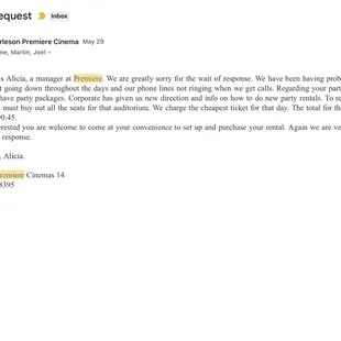 Tried to book a private rental on the website. It says rental is $100 for up to 20 people. They never responded so I called every single day, emailed and msg on fb with no response from them. I had to call corporate to get to the point of paying for the booking, when I tried to pay , the manager informed me they don't want to do this anymore, I will need to pay for every seat to have private rental. Well above the advertised price on their website. They get you in with the false advertisement and try to get more money when you get there to pay for it. Premier Burleson 14 has deceptive advertising and they were rude about trying to collect for every seat. $$$$ They told me that I have to pay for every seat or don't rent from them! (However, AMC Burleson ,their competitor, also has this advertised for $99 ,and they certainly did honor theirs.)