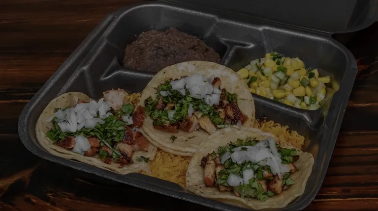 2 street tacos, rice, bean, and corn salad.
