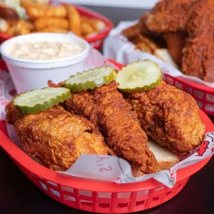I had the tenders combo. They were large pieces of white chicken breast with a fried crust on them. They douse them with a sauce so it's not too oily. Xhot is really hot and they have a level above this!The fries are crinkled with a hot spice on them. Very good.