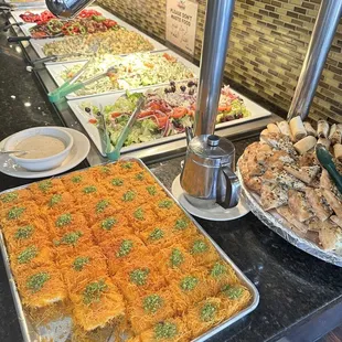 First of all, the service is wonderful.. We came on a Sunday, so no buffet... but the food was so delicious and fresh.. We had the chicken Shawarma, baba ghanoush, hummus, tabouli salad, meat pie, and a kebab.. all of which was amazing. We also left with the baklava cheesecake, and oh my goodness, YUM we will absolutely be back