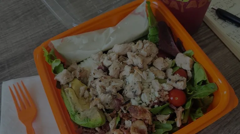 Avocado, marinated chickpeas, Brussels sprouts, cucumber, croutons, spinach, romaine and chicken or tofu, or steak (add'l charge). Paired with lemon basil vinaigrette (add 280 cal).