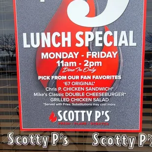 I've been to Scotty P's twice and it's in a good location close to everything. They have counter service and lots of TV's so you can catch a game from pretty much all angles.One Thursday night I came by after visiting the chiropractor and decided to come here. I looked on their menu and they had the Thursday Scotty P's special chicken sandwich. I went ahead and ordered the item and specifically asked "is this the Thursday special" in which I was told yes. I got a substitution for onion rings instead of fries instead (extra $1). The total came out to almost $20. So after a little prodding and questioning they were able to fix the discount. I'm a pretty big fan of pub food so this was a perfect meal since it came with a fountain drink as well. This is self-seating but they bring the food over to you. It wasn't too crowded on a Thursday night but it could get busy during a big game.I would say 3.5 stars but I'm willing to give them a benefit of a doubt due to the lack of knowledge for discounting the daily specials.