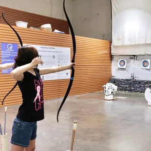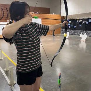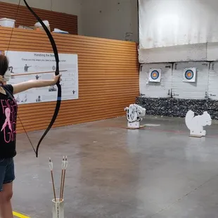 Looking for something different to do with my daughter and we ended up here. Neither of us have actually held a bow n arrow but we watched "Brave" and "Hunger Games" and felt we'd be experts. The truth was something totally different. The staff was very friendly knowledgeable and helpful. Walked us thru every step with patience and gave great suggestions for improving our aim. When our session was over I was actually hitting my targets instead of the wall behind them. It's a great outing for the cost and we will definitely be back!