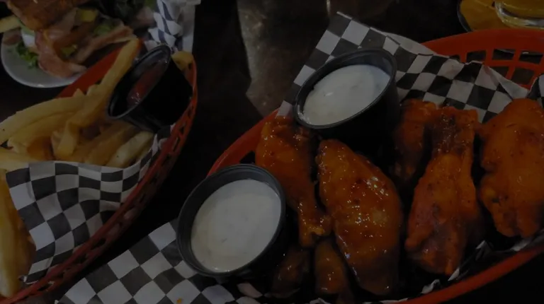 a plate of chicken wings and fries