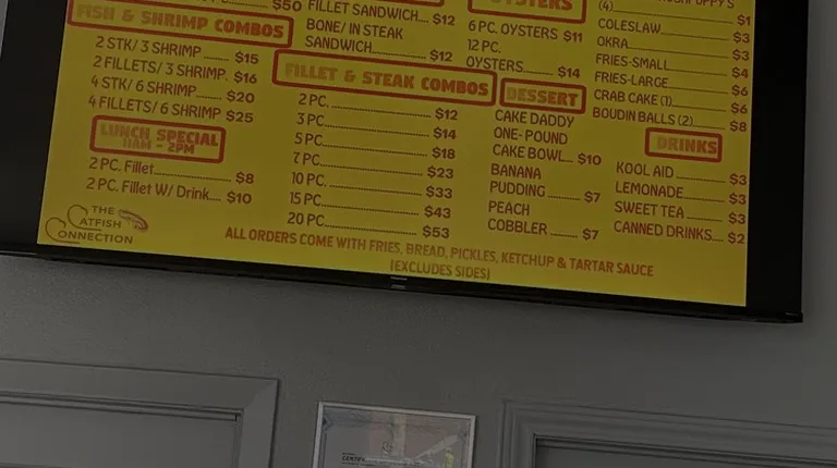 First of all. My first time. Take out only. Fish good. Menu is not accurate. Ask pricesI ordered 6 piece catfish nuggets. Menu says 8.50They tried to charge me over 11.00. I protested and pointed out t the Menu. They dropped the price to 9.50.I told them really need to update Menu. Otherwise ok
