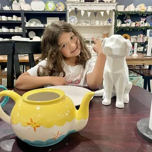My daughters and I were searching for a great place to spend a few hours to paint pottery. It's been quite a few years since we painted pottery so we were really looking forward to the day. Thank you to the reviews on Yelp, we found the best of the best at The Painted Teacup! It is independently owned and not a chain which was important to us. I sent an email to the business at 10pm requesting to reserve a spot for the following day. I wasn't expecting it to be answered until the next morning and to my surprise, I had a response shortly after sending it with a confirmation for the 3 of us. Walking into The Painted Teacup was magical and we knew if would be before we even stepped foot inside. The decorated bicycle in front of the business, the paintbrush art hanging in the window of the shop, the signage...we just knew it would be fabulous and it didn't disappoint!The creativeness of the decor is beyond amazing! I had to just stop and take it all in for a few minutes. Cayman and her mom have made an amazing space. It's eclectic, whimsical, beautiful and creative. Everywhere you look, there is something new to discover. Dallas, the resident 4-legged doggie hangs out in the corner in her princess bed and happily greets customers. Don't worry, if you are fearful of dogs, Cayman will leave her leashed. We are dog lovers and welcomed her to roam. Such a mellow and sweet dog, she made our day (you too Cayman!) Nothing better than pet and paint therapy all in one visit!The pottery selection was vast and there is something for everyone to paint. There are plenty of examples of painted pieces to look at if you have creative block. There are stickers and stencils to help with your painting if desired and plenty of paint colors to select from. In front of each paint color to choose from, there is a small child size teacup and saucer that is painted and fired so you know the outcome of that particular color. This was really helpful. Cayman provided all the instruction we needed to work on our projects.The tables are perfectly set for all the incoming artists. With brown paper 'placemats' to set your piece on, draw on or make notes, it was so much better than working on a paper towel! Napkins were also provided but the favorite part was the water for washing brushes off was in a big teapot. I love how the theme of this shop is carried through to details like this! The paint brushes were of good quality too. This is important! There are an abundance of stylus tools too for making any size dot/polka dot you need.Speaking of teacups...You will see them in pictures (check out the first bathroom) of various stars sipping tea, on a candelabra, and placed throughout the store. My pictures don't do it justice, you must go see for yourself. They do allow byob if you want to come paint and sip some wine.We opted for Boba Tea which was sold just a couple doors down. There is also a quaint coffee shop a few doors down that has coffee, tea, macaroons and other sweets and treats. You can bring anything you want to eat/drink to enjoy while painting.The prices are reasonable and the experience was perfect for my teen daughters and myself. We can't wait to return to pick up our masterpieces! My youngest had so much fun, she asked if we could return in a week or two so Cayman doesn't forget who we are. I love that so much!While you're there, don't forget to look up on top of the paint cabinet at the amazing dress form with the the painted 'prom' dress Cayman created! If I could give this shop and the experience 10 stars, I would!