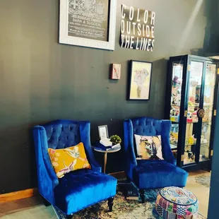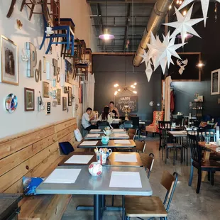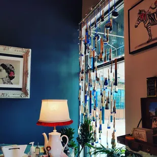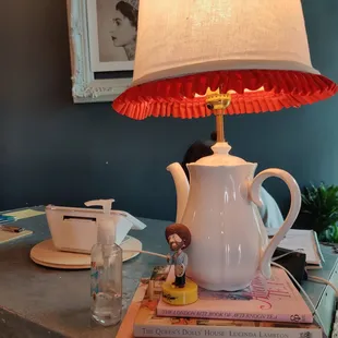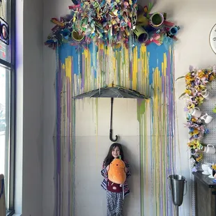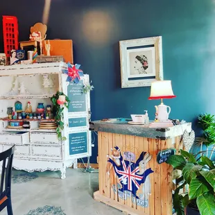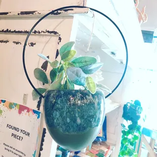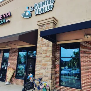 I brought my daughter and her friend to do some painting this weekend and was pleasantly surprised by The Painted Teacup. So many awesome things to say about the decor of this place! At the entrance of the store there is a colorful bike adorned with flowers that really draws the eye in. The window is decorated with hanging paint brushes and teacups, I absolutely loved the idea! There are several photo moments, one being paint falling from the sky and an umbrella that you can take the picture underneath. So inventive! The other is a photo op of a jail lineup where you can hold your sign with all the fun painted tea cup info.There were beautiful blue chairs for a sitting moment to the side and two fabulous Frida chairs flanking a table in the back. I found myself finding something interesting to look everywhere I looked, including a Bob Ross bobblehead at the register. Very well laid out and fabulously designed.I did think that the pottery selections were a bit overpriced compared to the other pottery painting places I have been to, but they did have some fun things to pick from. I painted a large coffee mug, my daughter painted a vase and her friend painted a plate.The amount of paint that they give you is pretty miniscule, I found myself multiple times needing a refill and the workers wanted to handle that themselves. They were very friendly and helpful but multiple times they were nowhere to be found and I was just sitting there waiting. One worker was sitting and painting with her mom and walking around painting something in her hand, so had her hands full.It was a beautiful spot and definitely a fun area with boba tea and restaurants right next door so you can make a fun day of it.There was no studio fee and the items will be glazed and fired, ready to pick up in a week.I will definitely be back with some girlfriends to paint in the future!