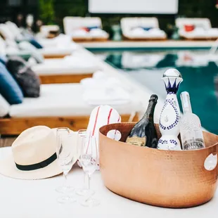 Glass of rosé by the pool. Classy + modern ambience that is perfect for a night with friends by the pool.