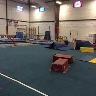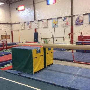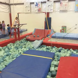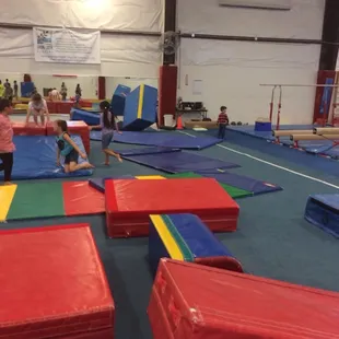 I was here for a child's birthday party and it was a fun time. The kids had about 45 minutes to play with whatever they wanted. There were staff present to make sure things were safe but there were plenty of parents around as well. The main attractions for the 3-5 year olds range was the trampolines and the sponge pit. No one really touched the bars or the balance beams.After that, we went into the party room where the staff served the kids and we had the cake cutting. The kids were then allowed to play for another 20 minutes or so, which I was surprised about given that they had just eaten. All in all, we were there less than 2 hours and the staff could have been more cheery. On a side note, this place turns out some good gymnasts as they are proudly displayed on the wall with where they go to college.