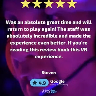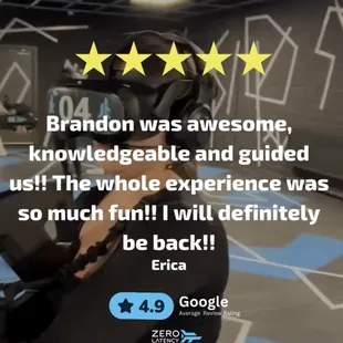 10/10 Experience @ Zero Latency with our guide Angel. He was very helpful in helping us get set up as well as with recommendations with what game to play. The VR itself was beyond our expectations and well worth it. If you're thinking about trying a VR location id recommend this location. Angel should be employee of the year; I will definitely be coming back again.