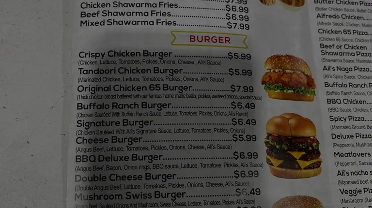 65 CHICKEN BURGER ONLY AT ALI's Pizza Thick and juicy layered meet inside and beauty crunchy look outside Can't get any better