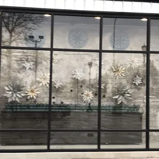 a cow statue with a mirror in the background
