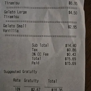 I came here just to pick up a slice of tiramisu. It's an Italian dessert so what better place to get it from than an Italian restaurant. Every person we came into contact with was so friendly and welcoming. As we waited for the tiramisu slice, I noticed an area with different flavors of gelato. The man behind the counter was so gentle and friendly and gave us a sample to try. It was delicious! So I looked over at the cup sizes and prices, boy are they pricey !!!!!! I ended up getting tiramisu and vanilla gelato alongside the slice of tiramisu. This was a gift for someone, and they couldn't get enough of it saying the flavor for both were phenomenal! They were happy with every bite.