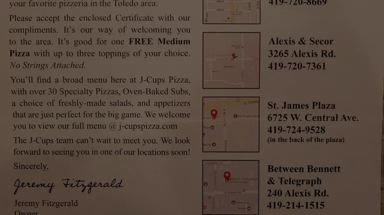 I recently purchased a house and not long after taking possession of the home, we received a coupon for a free medium 3 topping pizza. The coupon was due to expire today, so I called the phone number for the J-Cups Pizza in St. James Plaza on w. Central Ave to place my order. Pizza was going to be ready in 10 minutes and I live within a mile of this location thinking we may have found a go-to pizza location.I pull into the parking lot and the marquee sign at the entrance has J-Cups Pizza as one of the businesses located there. I dove up and down the length of the strip of storefronts and I couldn't find J-Cups any where. I drove out of the parking lot thinking maybe it was in the stores next door - nope.I go back into St James Plaza to search again - nothing. I am frustrated beyond measure at this point thinking how can I miss a storefront. I called the phone number for that particular location and the same error answered when I placed my order.I asked her where exactly in St James Plaza are you located, she said that location is no longer open and I was speaking to someone in the J-Cups location on Alexis & Secor (about 15 mins or more drive time).I walked in and informed the person at the register of my run around to actually get to their location and then asked when the W Central Ave location was closed. I was told they closed in February. What? And the J-Cups Pizza still has their sign up on the marquee in St James Plaza? The cashier nervously giggled and said she didn't know when they would be taking the sign down at St James Plaza.To make matters even worse, the coupon clearly states the location in St James Plaza and I did not receive the coupon until July!Sorry J-Cups Pizza, if this rating could be a zero it would. Very poor business management! I will not be returning again.