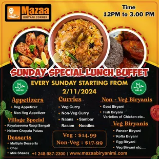 As a first time customer and a neophyte to Indian food, our waitress was so very helpful. She explained everything and made suggestions. Visiting on a Tuesday, some of our group ordered the dosa buffet. A delicious set of choices to go with the specially ordered dosas. All staff were friendly and encouraging. It is a small space but do not be discouraged as you enter. The food is BIG in taste and my husband's order of chicken tikka was huge!! We highly recommend Maaza Biryani Corner!