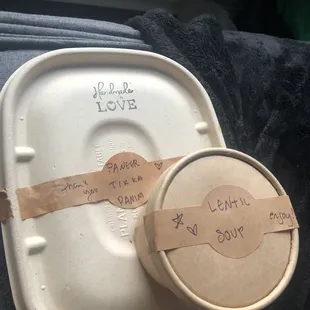 My partner and I both got paninis. I had paneer, she had chicken. We tried both, they were awesome. She's never had paneer before and she liked it a lot. The lentil was great, too. Will definitely have y'all again. The reason I'm writing this review is unrelated to the food, though. I just want to say thank you to whoever made our dinner. We ordered delivery today because we were both down for the count. She's sick and I just got news that my dear friend passed away. It might seem small, but the little notes made us smile. We needed it. Thank you.